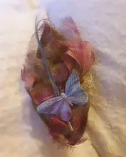 This piece merges boldness and elegance. The hand-rolled, sprayed sinamay base forms the foundation, complemented by a graceful feather quill and an intricate butterfly detail. Sitting on a hand-rolled sinamay and round straw base with a satin trim, it’s designed for both style and sophistication. The fabric headband ensures a comfortable and secure fit, making this a standout accessory for any occasion.